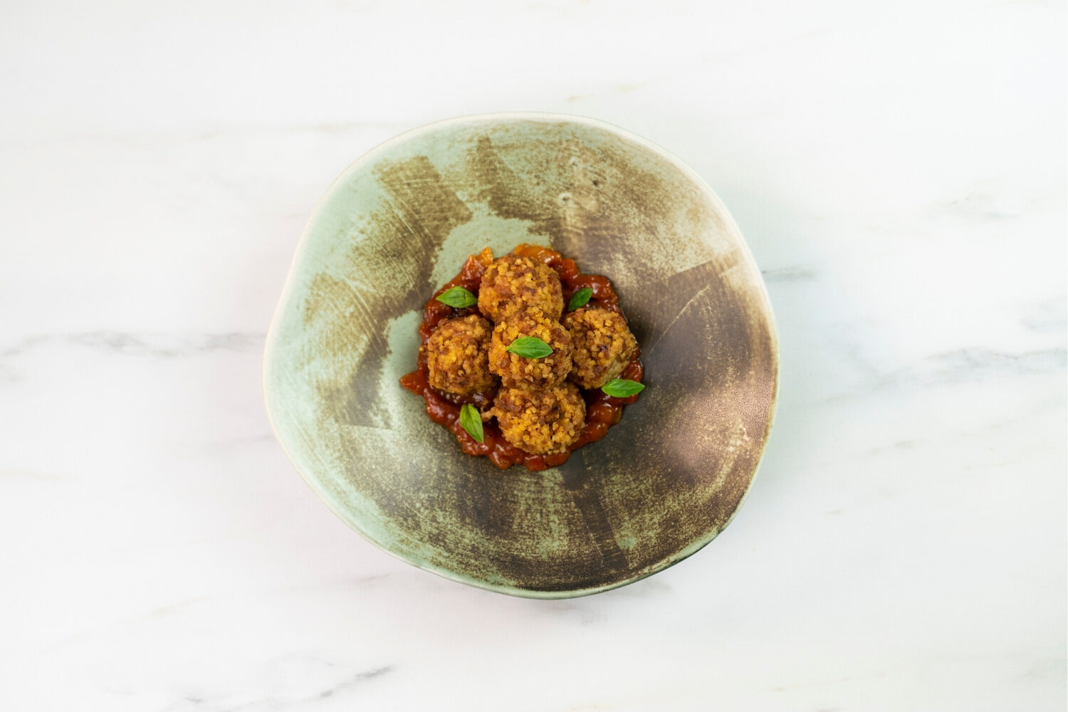 8. Servir las albóndigas con un poco de salsa de tomate y algunas hojas pequeñas de albahaca para decorar.