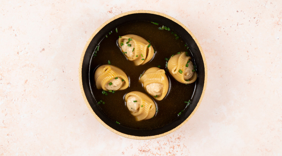 Caldo de Navidad vegano con galets rellenos de burger vegetal Amara sabor a pollo
