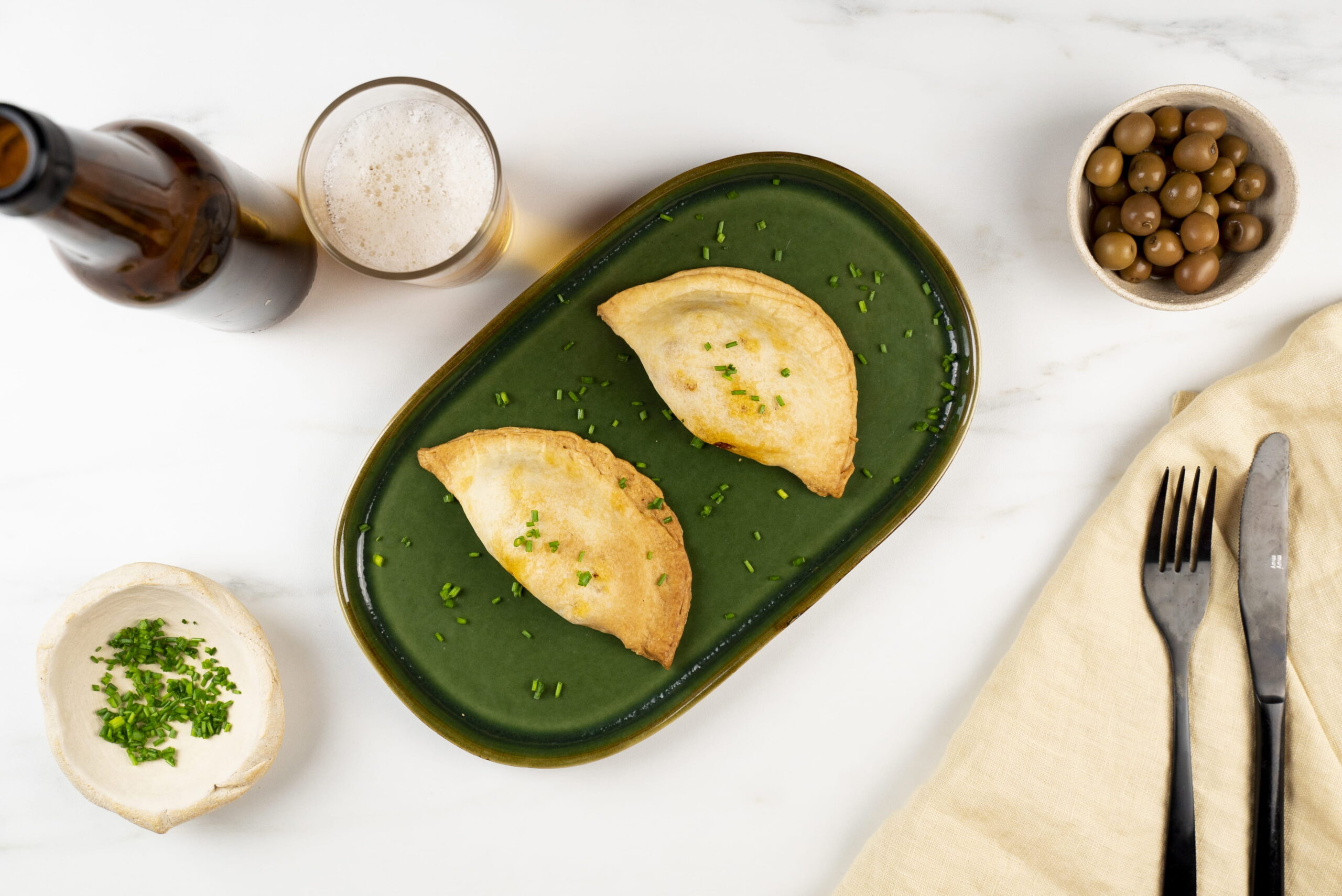 - Para emplatar, servir las empanadas de burger vegetal sabor bacalao en un plato y espolvorear un poco de cebollino picado.