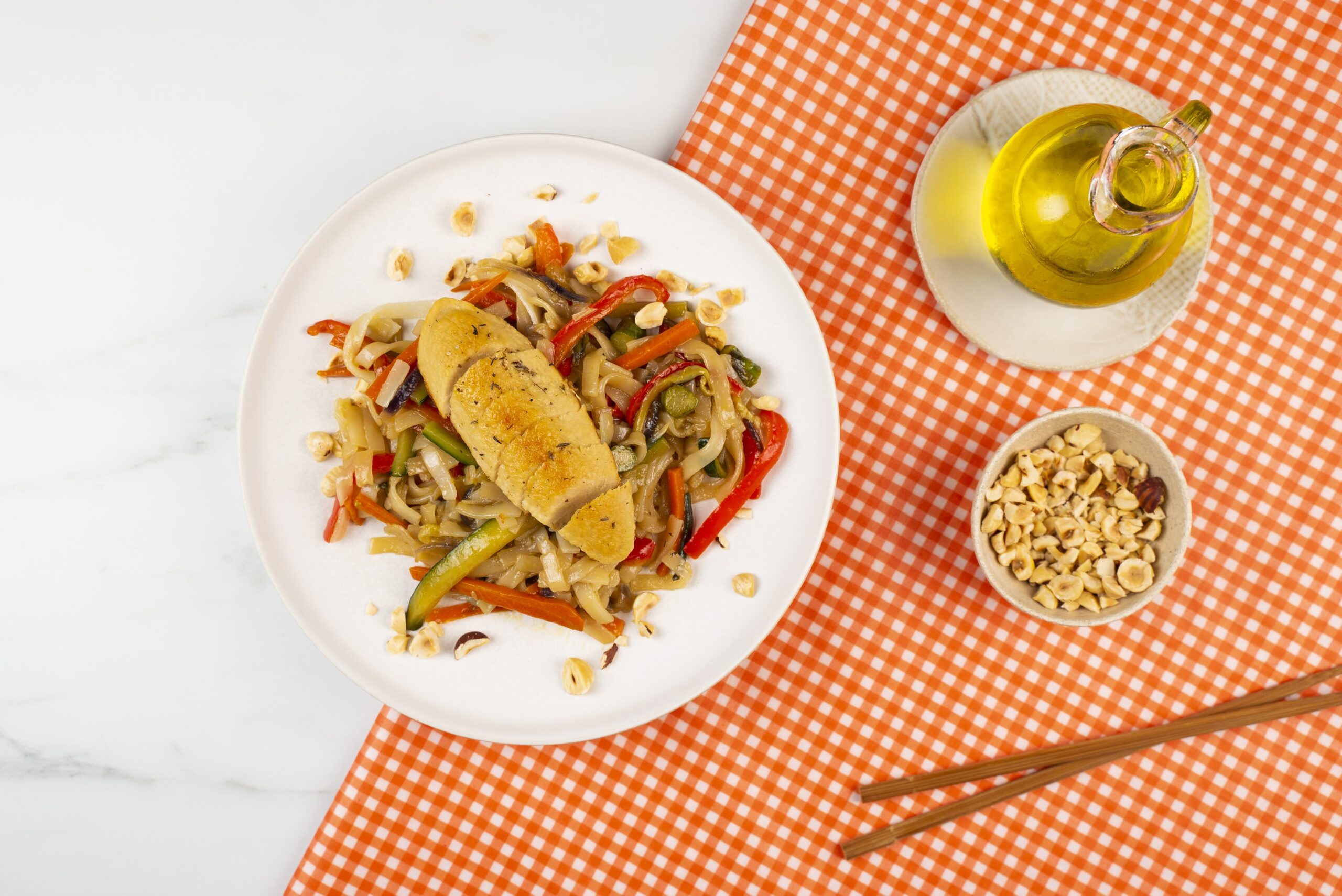 Descubre una receta plagada de sabores y texturas diferentes. Combina la suavidad de los tallarines de arroz, con unas verduritas sabrosas y el tostado crujiente de las avellanas, en un plato protagonizado por los deliciosos y versátiles Quorn fillets. Sorprendente, buenÃsimo… ¡y fácil!