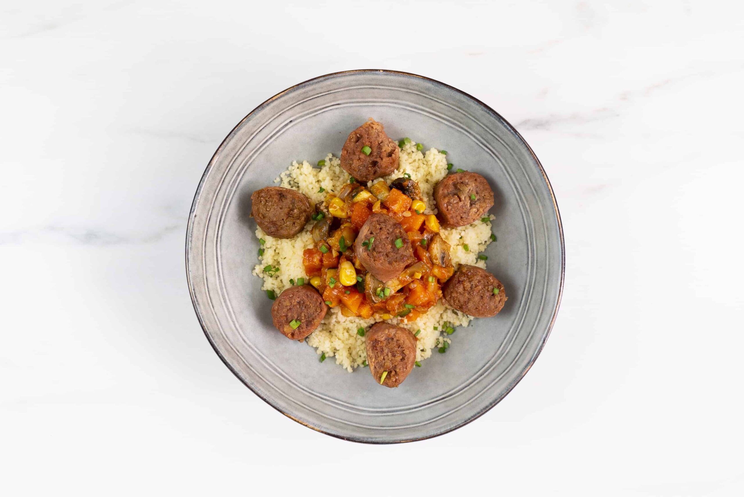 11. Para emplatar, colocar un poco de cuscús en la base del plato y encima de este, la salsa de verduras con las Sausage Beyond. Decorar con cebollino picado por encima.